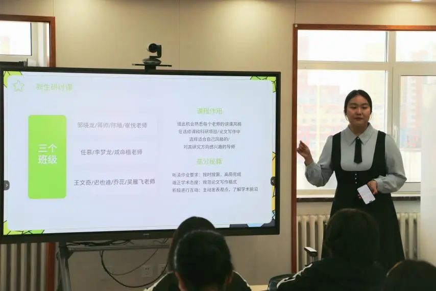郭子涵同学就专业课学习经验与大家进行交流分享。她带领大家逐门了解新生研讨课、外交学学科导论、政治学概论和专业英语一四门专业课,对每门课程的授课教师、课程难点、学习方法、考试技巧进行了介绍。随后,郭子涵同学向大家提供了几条学习建议,鼓励大家“有计划、有目标、有方法”地进行大学学习,循序渐进,行稳致远。